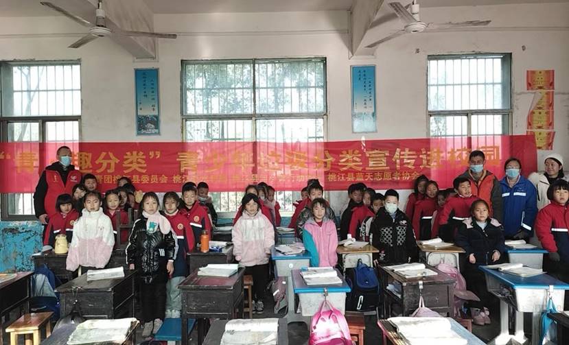 (本网讯:宁武曾辉)为引导青少年养成分类投放垃圾的好习惯,倡导低碳生活保护绿色家园的理念。近日,桃江武潭镇八一小学在蓝天义工的组织下,开展了垃圾分类进校园的宣传实践活动。全校近500名师生参加活动。
