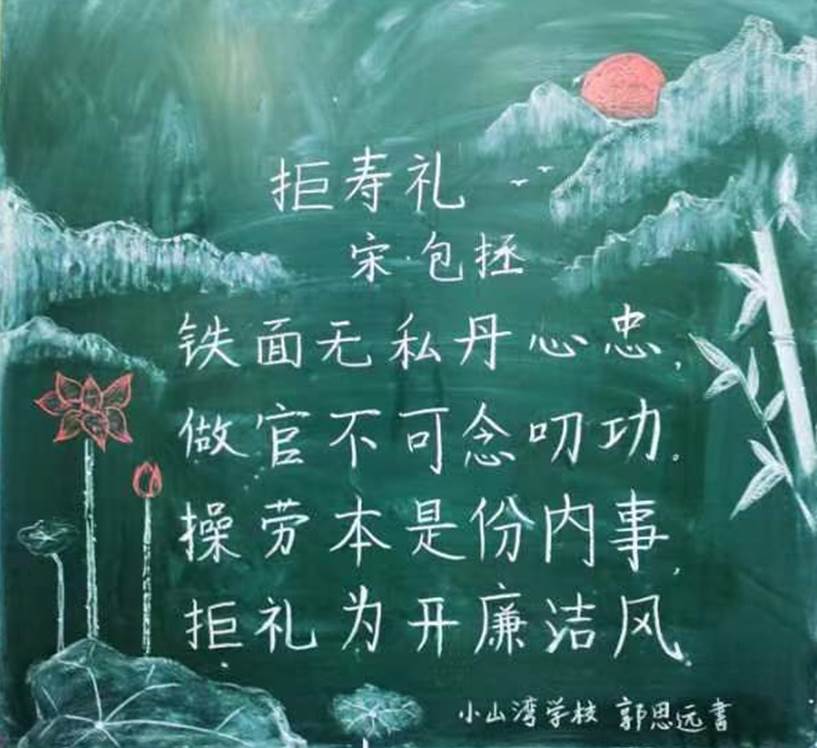 “操劳本是分内事,拒礼为开廉洁风。”小山湾学校郭思远老师在“廉润我心”粉笔字基本功评比中如是写道。