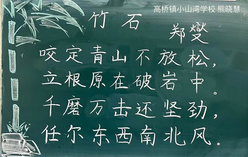 据悉,高桥镇中心学校为促进青年教师基本技能提升,于4月中旬开展全镇范围内青年教师基本功大赛,截至4月26日,小山湾学校17名青年教师参与活动。熊晓慧老师的《竹石》,笔锋苍劲,配画淡雅。她说:“一支粉笔,两袖清风,三尺讲台。以竹为师,思廉修身。”