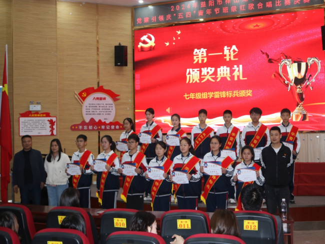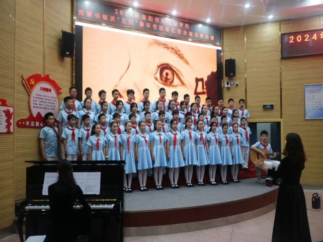 4月30日,湖南城市学院附属梓山湖学校多功能报告厅内歌声悠悠,该校以“弘扬五四精神,放飞青春梦想”为主题的2024年“五四”青年节班级合唱展演活动正在举行。