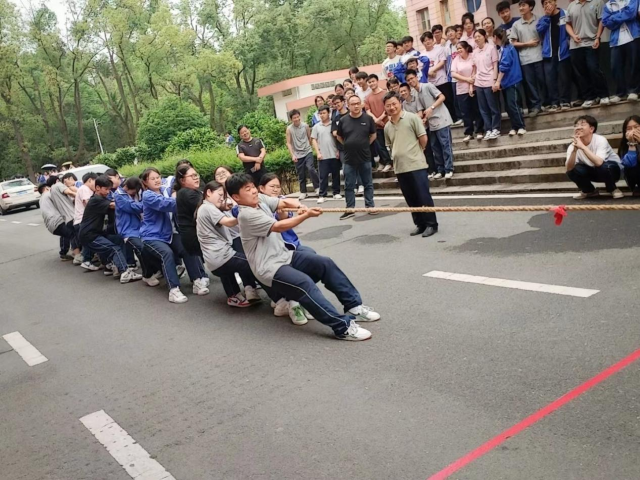 比赛双方有序地聚在两端,紧紧地握着麻绳,脚抵着脚,身体后仰。哨声一响,拉扯声、口号声、加油声,声声入耳。不论是参赛者,还是拉拉队成员,他们都卸下学习的担子,全身心地享受着比赛带来的松弛感。