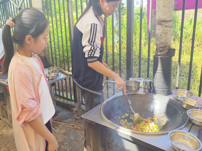 实践基地一派繁忙景象,学生化身“小农人”和“美食达人”,在教官指导下,挖坑、播种、盖土、浇水,择菜、热油、翻炒、调味,整个过程井然有序,欢声笑语此起彼伏。