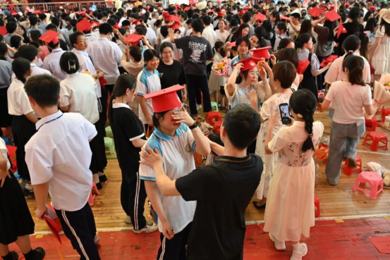 各位家长、老师为同学们戴成人礼帽。深深的仪式感里蕴藏着师长对同学们成年的美好祝愿和殷切期望。