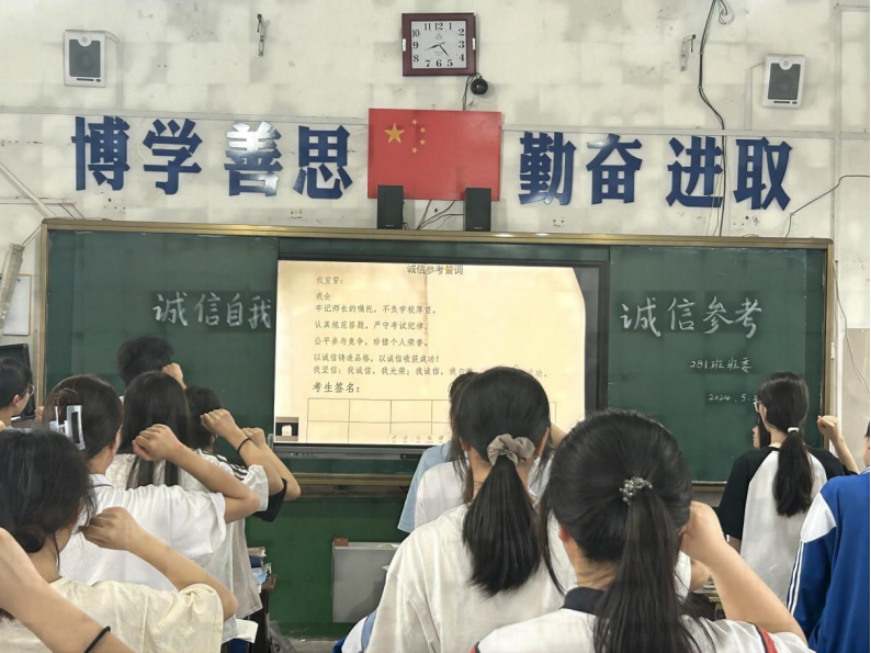 活动中,各班级在班主任的带领下学习了教育部《国家教育考试违规处理办法》第二章违规行为的认定与处理的内容,了解了哪些是违背考试公平公正原则的不良行为。通过这次班会,展开了以“什么是诚信参考”为主题的班级大讨论,同学们讨论热烈,不少学生表达了自己对于诚信参考的理解。接着举行了“ 一句话话诚信”活动,各班达成了班级的“诚信参考公约”。最后进行了宣誓与签名仪式。同学们积极参与,感受颇深。
