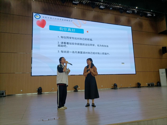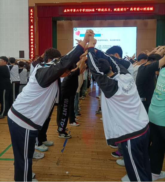 接着,学校心理老师刘雪红老师给同学们带来了一场别开生面的心灵减压活动。团辅以暖身游戏“小明说”为开场活跃现场气氛,调动了学生的积极性,以“释压”“赋能”为主线展开了“穿梭呼啦圈”“穿越龙门”“有你真好”等活动。学生们在开场活动中意识到,无论是在意游戏结果渴望成功,还是不想被淘汰而产生巨大的压力,都是正常的现象。在“穿梭呼啦圈”的活动过程中,同伴之间抱团取暖、并肩前行,一同完成传递的任务。同学们感悟到原来有了他人的支持,我们可以更好地面对压力。“穿越龙门”环节,同学们为身旁的同学搭起了一座又一座龙门,伴随着音乐,高三学子依次穿越龙门,至队伍终点排队又为身后的同学搭起龙门。在最后的环节中,同学们写下对自己、对同学的深深祝福,写下对恩师的声声感谢,走向主席台,为梦想加油!