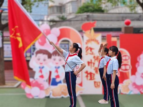 仪式开始,伴随着出旗曲的响起,护旗手穿着整齐、步伐矫健护卫着鲜艳的队旗入场,全体少先队员肃立,齐唱《中国少年先锋队队歌》,嘹亮的队歌充满了昂扬向上的动人力量,传达出了队员们勇往直前的信心和决心。随后,学校少先大队委员罗锦熹同学宣读了新队员名单。激昂奋进的音乐响起,高年级的老队员代表迈着铿锵有力的步伐,来到新队员面前,为他们佩戴红领巾并互敬队礼,这是荣耀的传递,也是责任的传承。