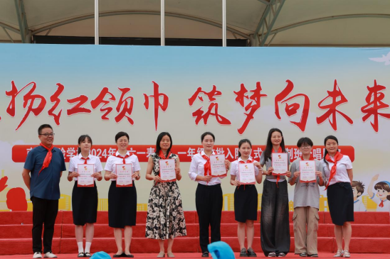 活动中,展演与颁奖穿插进行。现场104名优秀学生、8个班集体进行表彰,学校领导为获奖班级和个人颁奖并合影留念,操场上响起了热烈的掌声。笔者了解到,这是该校“新时代好少年”学习、争章评选活动选拔出来的优秀个人及集体,通过班级推荐、学校少先大队部初选、评选、县市级推优等环节,最终确定表彰名单。