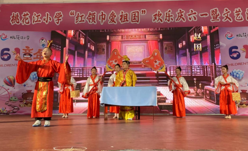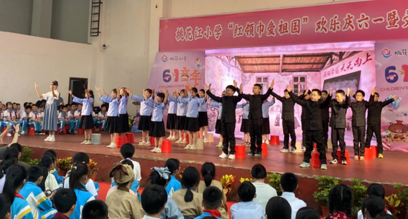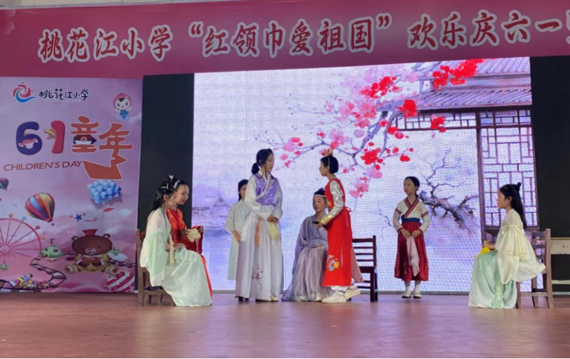 本学期,桃花江小学开展了主题为“沐浴时代春风,悦享整本经典”的第十六届读书节活动,这是本届读书节的五年级故事剧展演现场,同学们用盈满书香的形式庆祝自己的节日。孩子们在老师的指导下,认真阅读语文课本“快乐读书吧”中推荐的阅读书目,像五年级学生就主要阅读了《红楼梦》《三国演义》《水浒传》《西游记》四大名著。而各年级则通过不同的活动来展示读书成果,二年级全体师生就以韵味悠长的童诗展演来欢庆“六一”。
