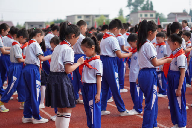 “全体起立,出旗!”随着激昂的《出旗曲》奏响,活动在庄严肃穆的氛围中拉开帷幕。全场齐唱《中国少年先锋队队歌》,大队辅导员刘雯文宣读“批准入队决定”以及新队员名单后,四五年级的少先队员们手捧着象征光荣和使命的红领巾,为新队员们一一佩戴。佩戴过程安静又整齐,仿佛在进行责任的继承、使命的传递。新老队员互相敬队礼,鲜艳的红领巾挂在胸前,那是多么自豪又神圣的一刻。一年级160名学生完成了他们人生中一次意义重大的、激动人心的仪式,在六一儿童节即将到来之际,解锁了他们人生的新角色——中国少年先锋队队员。