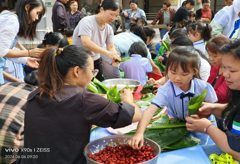 活动的重头戏自然是孩子和家长们一起包粽子。“一折叶,二盛料,三压实,四包裹,五扎绳”,家长们手把手地教孩子们包粽子,他们手艺娴熟,动作麻利,一气呵成。孩子们也不甘落后,跟在家长后面当小帮手,一起包出来的粽子棱角分明,大家都忙得不亦乐乎!