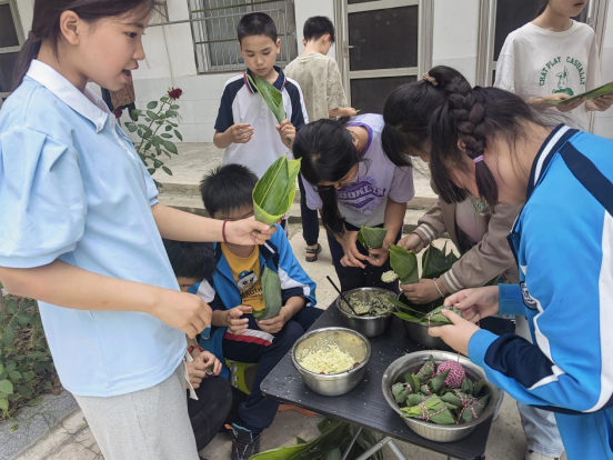 六年级黄欣语同学说道:“每年都是爸爸妈妈为我包粽子,今年也让他们尝尝我包的粽子的味道。”活动结束后,孩子们准备把剩余的粽子带回家分享给家人。
