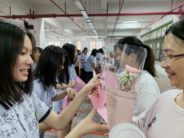 活动现场,九年级学生与食堂工作人员、寝室生活老师等共聚一堂、共话感恩。学生代表发表了热情洋溢的讲话,字里行间流露出对后勤人员的感激之情。学生还将精心准备的奶茶、鲜花、锦旗等礼物赠送给后勤工作人员以此表达感恩之心。后勤人员则向学生回赠中考祝福语,激励学生敢于拼搏,圆梦中考。