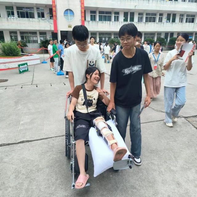 本网讯(通讯员 卜令波)在六月的热烈阳光中,沅江二中的校园里上演了一幕感人至深的青春篇章。6月19日,初中毕业生学业考试进入第二天,初2101班的文颖知同学不慎摔伤,骨折的痛苦让她行动艰难,面临着无法继续参加考试的困境。阳鑫磊、黄俊熙、周玮才等同学急匆匆地找来了轮椅,还细心地拿来一个枕头,让文颖知把受伤的脚搁在上面,以减轻疼痛。他们推着轮椅,小心翼翼地护送着文颖知前往考场,确保她能够顺利参加考试。