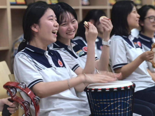 活动采用了“鼓圈”即兴团体演奏形式,学生围坐成一个圆圈,在引导师的推动下自由演奏打击乐器,其目的不是表演,而是促进参与者在鼓圈中得到成长,缓解压力。体验触觉、视觉、听觉、感觉、运动觉等多方面的细微变化,感知当下内心真实自我。
