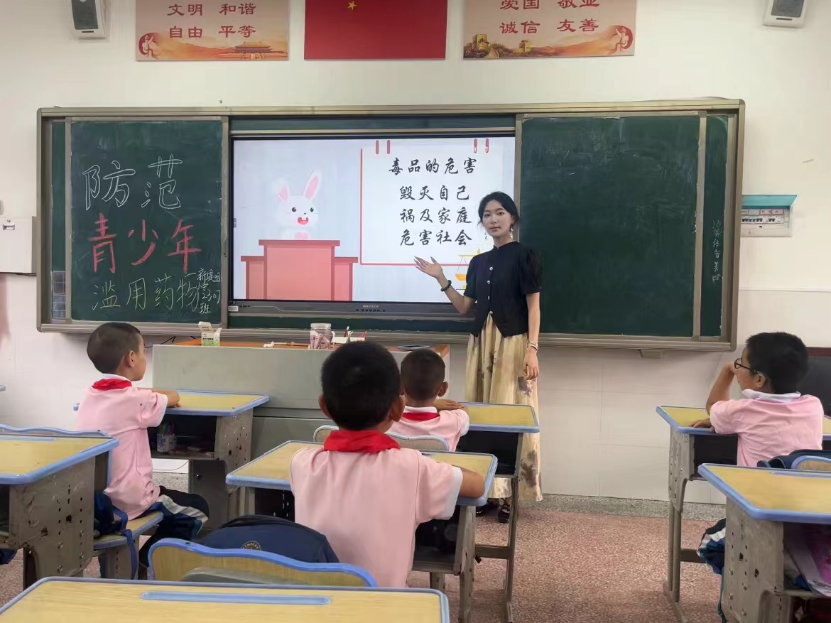 下午,在益阳市石码头小学新堤咀分校, 资阳区禁毒讲师宣讲团员谢佳怡开展了“庆七一, 防范青少年药物滥用,培养暑假禁毒小卫士”主题禁毒宣传教育进校园活动,在课堂中,谢佳怡向学生讲述了党的百年历史及烟卡游戏带来的危害。同时,组织学生观看了禁毒短视频,通过生动的视听体验,向学生讲解涉麻精药品等成瘾性物质滥用的种类和危害,深入浅出地讲解了如何识别和拒绝毒品的方法,加强了青少年毒品预防教育,提高了青少年识毒、防毒、拒毒的意识和能力, 让学生暑假争当禁毒小卫士, 向家人和身边人做好禁毒宣传。