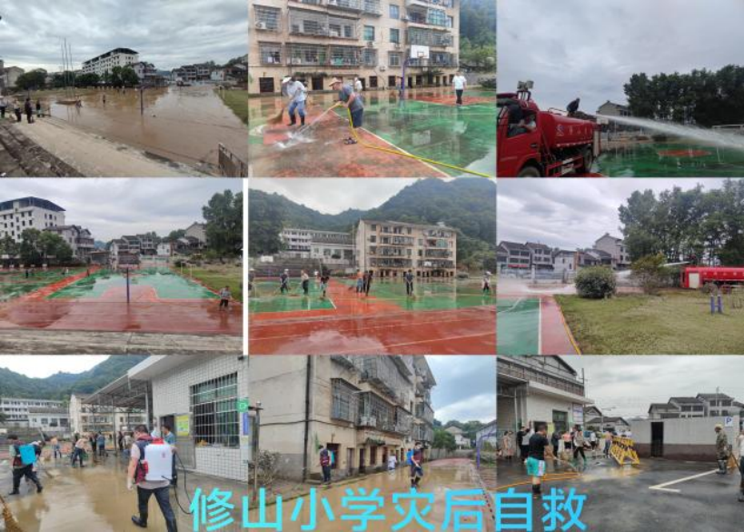 总务主任钟振球早上6点半就到达了学校,做各种准备工作,装电机,借水管,接水管……老师们穿着雨靴,拿起扫帚配合着钟主任,水管冲到之处,用力清扫,有的老师没有雨鞋特意去买了新的。吴怀宏老师身患血友病多年,走路都不方便,门卫师傅钟望明一双脚肿得厉害,钟霞老师身体非常不适,但都带病积极参与灾后自救工作。人工的力量毕竟是有限的,如果按现行办法,恐怕一天也清扫不完。修山镇党委、政府派遣消防车来了,校长郭安平第一个冲过去、爬上车一次又一次克服压力大、冲劲足、不便操作的困难,使出浑身解数,给校园进行“大清洗”。冲完一车又一车,累得汗流浃背了也不说声“累”,老教师郭建辉等也是自始至终全程参与;党员教师陈林和钟爱群、年轻教师朱超群等全程充当了骨干力量,一直坚持到清扫等扫尾工作。食堂工作人员,更是做好了食堂清洁消毒工作。