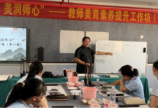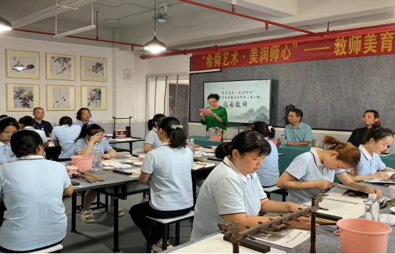 培训特邀益阳市希舜书画艺术中心专家汪胜军做水墨画技法主题宣讲与演示教学,特聘专家张迪为美育副园长。在专家指导下,全园幼师开展水墨画技法沉浸式实践操作,教师在实践中潜移默化地提升了审美素养、陶冶了情操、温润了心灵、激发了创新创造力。