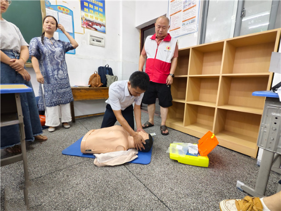 随后,实操环节将培训推向了高潮。红十字会的工作人员带来了专业的模拟人,让老师们亲身体验心肺复苏的操作过程。老师们分成十组,各个轮流进行练习。在红十字会人员的耐心指导下,老师们从最初的紧张生涩逐渐变得熟练自信。他们严格按照操作步骤,准确地进行胸外按压、开放气道、人工呼吸等动作,力求做到规范、准确、有效。