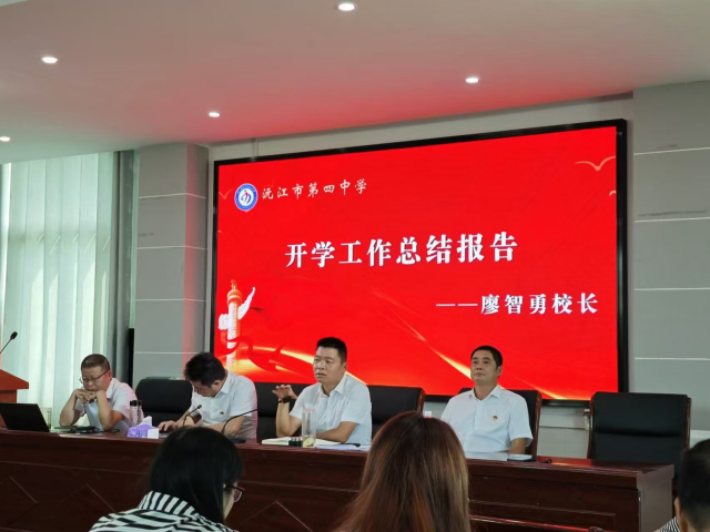 本网讯(通讯员 罗镕波)8月30日,沅江市第四中学在庄严的氛围中迎来了新学期的开学工作会议。此次会议由学校德育副校长郑鸿精心筹备并担任主持,学校党支部书记、校长廖智勇携全体领导班子成员及全体教师齐聚一堂,共同开启了新学期的征程。