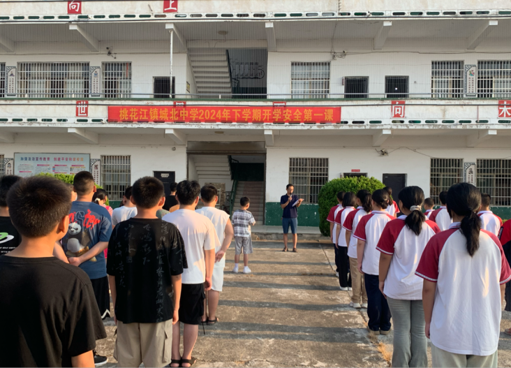 9月2日,桃花江镇城北中学为有效落实学校安全、德育、教学工作,提高同学们的自我防护能力,进一步对学生进行思想道德、行为习惯养成教育,避免各类安全事故的发生,确保学生健康茁壮成长,组织全体师生在操场举行了“开学第一课”活动。