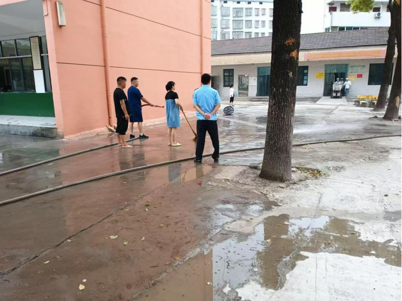 9月3日上午,桃江县灰山港镇向阳花学校校园里,镇消防救援站的5名消防员正用消防高压水管冲洗校园操场地面、走道、厨房前坪等,经过3个小时的奋战,学校地面洁净如新,整个校园环境干净清爽,为学校一千二百多师生营造了良好的环境。