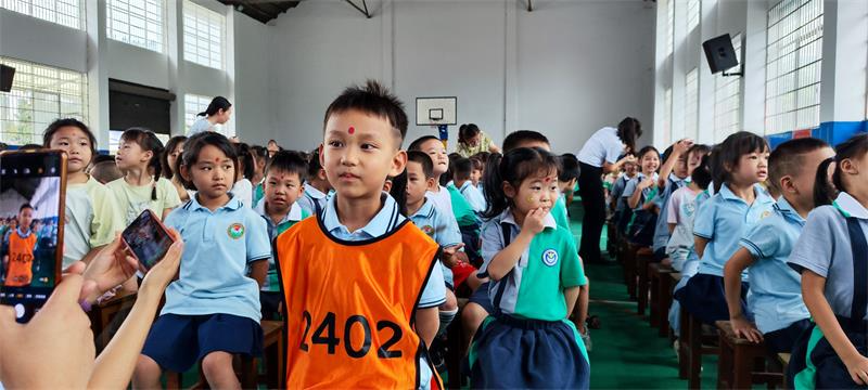 典礼上,一年级班主任手握画笔,小心翼翼地在每位孩子的额头点上“朱砂痣”,稚气十足的孩子们更加活泼可爱。