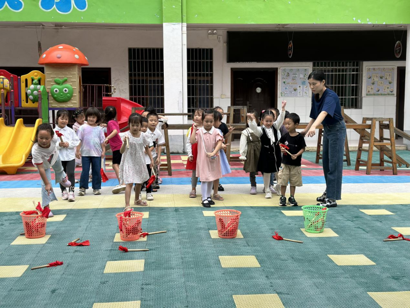 最热闹的是“投壶”游戏现场、孩子们在老师的引导下,举行比赛,一旦投中,则欢呼雀跃,整个幼儿园洋溢着节日的喜庆。