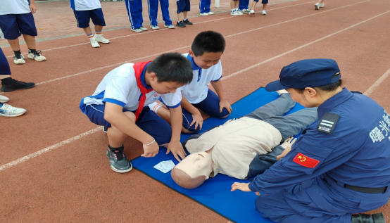全体师生集合完毕,曙光救援教练还给孩子们上了一堂心肺复苏急救演练课。