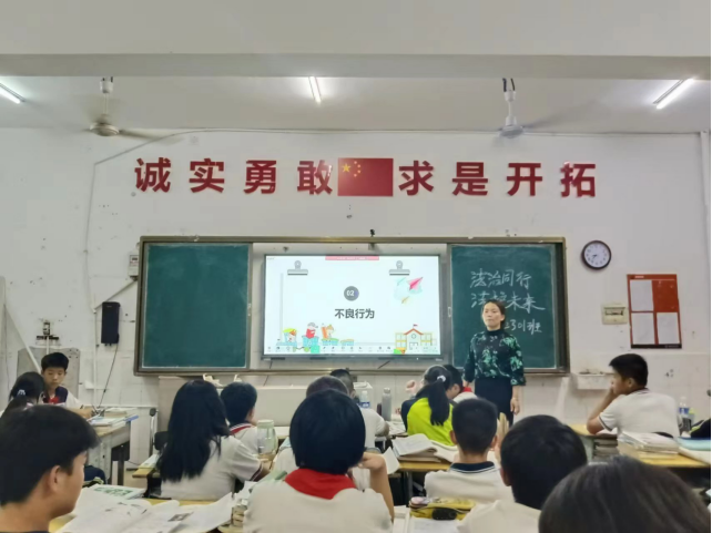 教室中拉着“诚实勇敢”、“法治教育 法护未来”的横幅,视频展示着“法治同行”和“守护你们的未来”的内容,强调了法律教育的重要性。学生们聚精会神地听着老师或班干部的讲解,通过观看视频,法律法规和典型案例分析等内容,引导他们树立法律意识,学生们积极参与讨论,加深了对法律法规的理解和认识。这种寓教于乐的方式,营造了“懂法守法”的良好氛围,让他们在掌握知识的同时,还学会了如何在实际生活中运用法律,增强了他们“防性侵,反霸凌”等自我防范意识。
