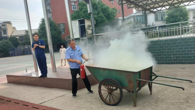 演练后,沅江市消防大队王教官对本次演练活动进行了全面的点评和总结,提出改进措施,进一步强调了逃生中应注意的问题。接着,他对全体师生从如何报火警、火灾的预防、火场自救及逃生方法等消防安全基本常识进行了讲解。还在操场演示了灭火器的操作程序,并且选取老师代表和学生代表上台实际操作,使师生们掌握了灭火器的使用步骤及运用技巧,有效地提高了师生们的防火技能。