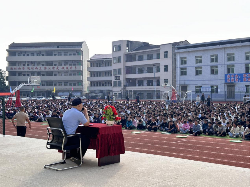 (本网讯 薛雅倩)为筑牢学校安全屏障,构建和谐安全校园,切实提高学生安全防范意识,引导学生学安全、知安全、守安全,10月8日上午,桃江武潭镇中心学校邀请该镇派出所唐志雄警官为学生带来一场意义深刻的法治安全教育讲座。