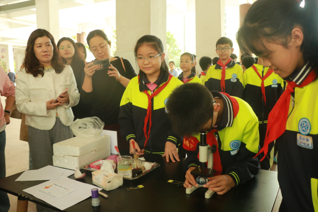 随后,与会教师参观了科普展览区。这里展示了科技创新画展及科创作品展。一幅幅充满想象力和创造力的画作,一件件精巧实用的科创作品,让教师们赞叹不已。小小解说员们更是用稚嫩而清晰的声音,向大家介绍着自己的作品和创作灵感,赢得了阵阵掌声。