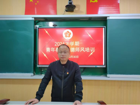 随后,江征宏副主任紧紧围绕“师德”这一关键词,运用一系列生动案例并结合自身教育经验,与青年教师热烈交流,深入浅出地讲述了教师在日常工作中践行好师德师风的重要性。培训中,江副主任鼓励青年教师以奉献、仁爱之心投身教育,争做桃花江镇一中师德师风“三好”老师。
