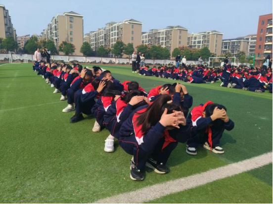 上午9:30防空预警信号声准时响起,同学们在当堂任课老师的指导下先关闭教室电器设备,再按照逃生路线有序地撤离。疏散演练过程有条不紊,全校师生沉着冷静,无拥挤、喧哗现象,快速有序到达指定的安全地带,由年级组长清点人数,最后汇报给党支部书记、校长钟蓉。