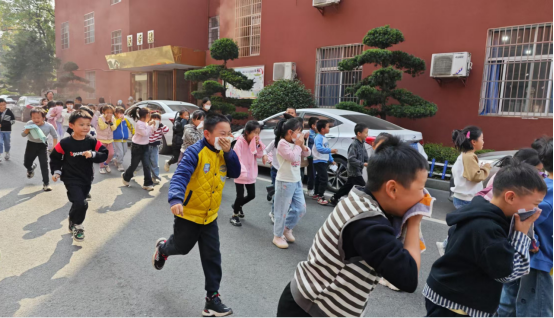 警报声响起,全体师生迅速行动,用手帕或衣袖捂住口鼻,弯腰有序疏散。各班级在老师的指引下,快速到达指定安全区域。