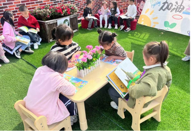 值得一提的是,此次活动还特别设置了草坪读书会。在年级组长的精心布置下,各班老师带领孩子们在草坪上享受阅读的快乐。这一活动不仅让孩子们亲近自然,还让他们在轻松愉悦的氛围中感受阅读的魅力。除了幼儿和家长的活动外,教师们也积极参与了读书会。由刘晓梅老师组织所有老师进行读书活动及分享,大家共同探讨教学理念、专业技能以及图画书阅读活动的组织能力。