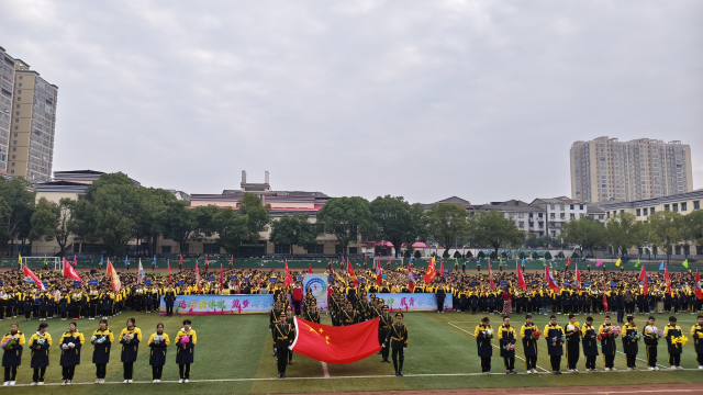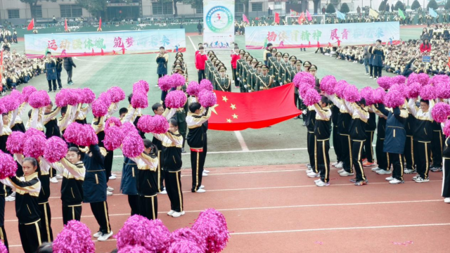 开幕式还包括了庄严的升旗仪式和精彩的方阵表演。国旗护卫队迈着整齐的步伐步入会场,五星红旗在雄壮的国歌声中缓缓升起,全体师生肃立致敬。随后,学生代表进行了精彩的啦啦操和双面旗方阵表演,展示了政通学子的朝气与活力,尤其是奔跑吧少年环节,追逐国旗的田径校队选手们将现场气氛推向高潮,观众席上人头攒动,掌声雷动。