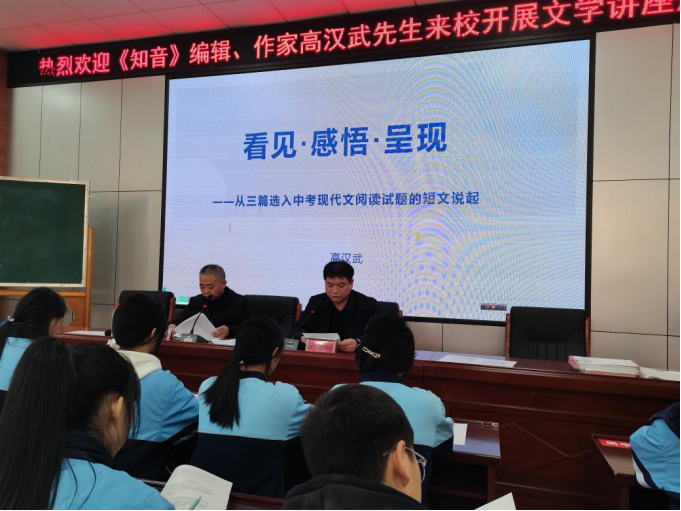 (通讯员:曾令娥)《知音》杂志编辑及作家高汉武先生,于2024年11月28日下午2时至4时,在桃花江镇中心学校致远楼五楼的梯形教室,举办了一场题为《看见·感悟·呈现——以三篇选入中考现代文阅读试题的短文说起》的文学讲座。110名杰出的新星文学社成员汇聚一堂,聆听了高汉武先生的精彩讲课。本次活动由文学社主编曾令娥主持。