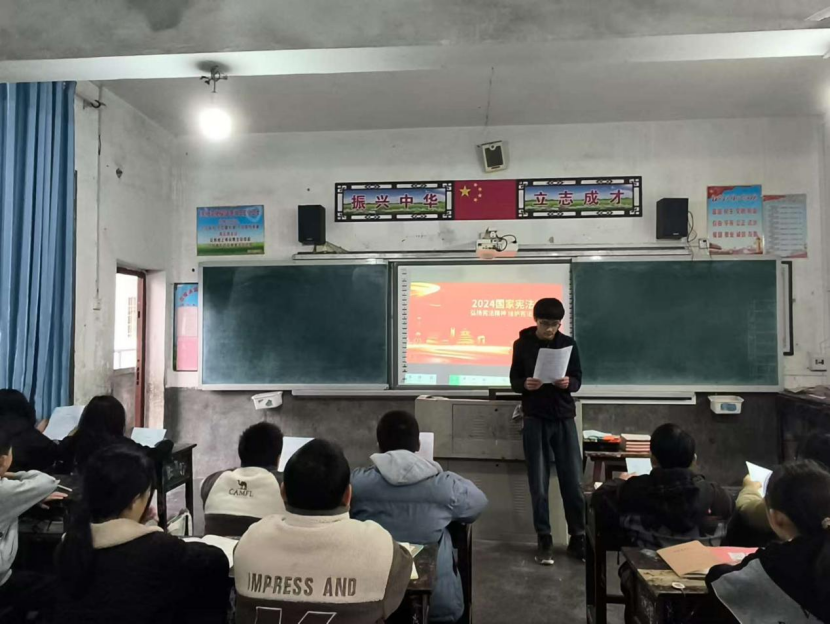 伴随着雄壮的《义勇军进行曲》,该校师生全体起立,在神圣而又庄严的氛围中齐唱国歌,并进行宪法宣誓。各班学生在班主任的认真组织下,集中收看由教育部组织的“学宪法 讲宪法”活动,齐声朗读了宪法晨读文本。学校相关负责人倡议全体学生首先从校规做起,规范自己的日常行为;走出校园后不仅自己始终遵纪守法,还要把法制意识宣传给周围的人,与家长、同学共同弘扬宪法精神,维护宪法权威。