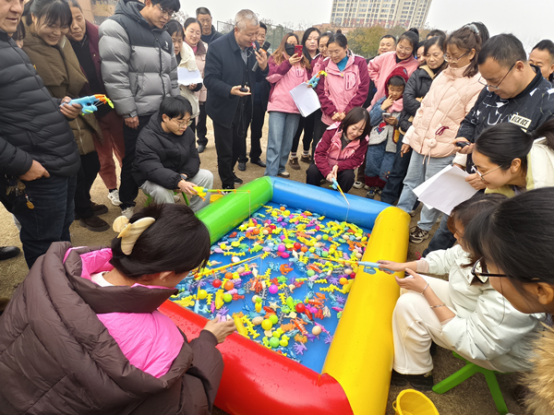 率先登场的“姜太公钓鱼”趣味十足,老师们围在“鱼塘”边,手拿特制的“鱼竿”秒变垂钓高手;随后的“单手捉泥鳅”“夹弹英雄”也精彩纷呈,滑溜溜的泥鳅和弹珠考验着老师们的耐心与技巧;最具喜感的当数“公鸡下蛋”项目,为了让“鸡蛋”顺利快点“产出”,参赛老师们全然不顾形象,随着动感的音乐肆意蹦跳、扭动,逗得周围师生捧腹大笑。