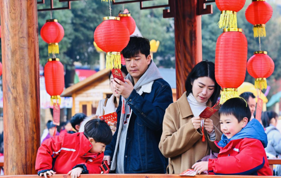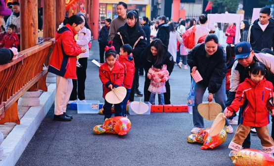 亲子传统游戏体验区成为了孩子们欢悦的海洋,16个趣味十足的游戏精彩纷呈。从“墨香挥春”中感受书法雅韵,到“猜灯谜”里的思维碰撞;从“新年剧场”的各类节目欣赏,到“摸福字”“吸福字”的吉祥寓意探索,孩子们与家长默契配合,尽情玩耍。每完成一个游戏就能收获一枚印章,集满16个章后便可兑换心仪的礼物是活动的一大亮点。