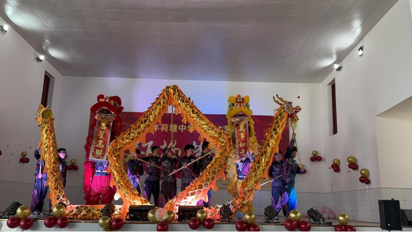 演出在龙狮舞的欢腾中拉开帷幕,瞬间点燃了现场的热情。校友龚胜权带着自己的学生团队为学弟学妹们带来了精彩节目,吉他弹唱,Rap等现代音乐元素与传统文化交相辉映,展现了青春的风采和音乐的魅力。