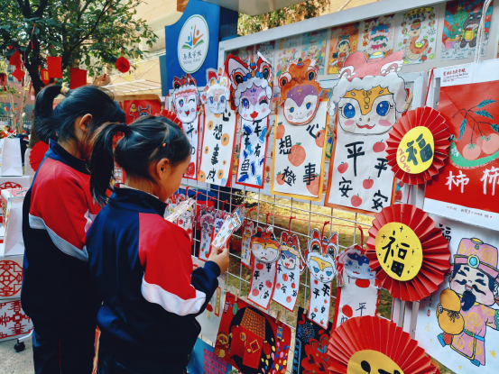 树枝上,围栏旁,各类艺术作品琳琅满目。绘画、泥塑、剪纸、摄影、手工艺品等多元艺术形式,吸引了众多师生驻足欣赏。春联、福字、贺卡、祈愿幡,如意袋、吉祥盒子……孩子们在美术老师们的精心指导下,用独特的视角与精湛技艺,展现了自己对家乡的热爱和对新年的美好祝愿。