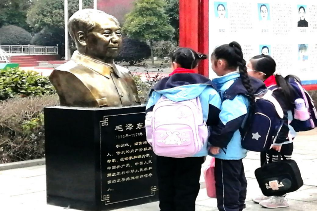 入校前坪,琼湖小学围绕“国学、家学、艺学、科学、研学”的教育路径,特立了8尊名人铜像,依次为:毛主席、孔子、钱学森、雷锋、陶行知、聂耳、齐白石。