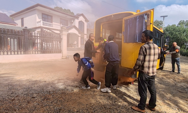 演练模拟了校车在行驶过程中突发故障并冒烟起火的场景。司机发现异常后,立即将车停靠在安全地带,打开危险警示灯,迅速熄火并拉起手刹。与此同时,随车照管人员迅速组织学生疏散,指导学生用手捂住口鼻,弯腰低姿有序地从前门和后门撤离校车。在撤离过程中,学生们保持冷静,听从指挥,快速有序地到达了安全区域。随后,照管人员认真清点人数,确保所有学生都已安全撤离,并及时向学校领导报告情况。司机则迅速拿起灭火器,对准火源进行扑救,成功将“火势”扑灭。