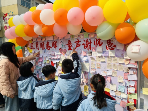 “张老师,您教我们做数学题时的样子真美!祝您节日快乐!”“代老师,我们最喜欢上您的音乐课,您的歌声真好听!祝您节日快乐,工作顺利!”……学校德育处组织全校学生开展“童声谢师恩”活动,学生们用五彩缤纷的便利贴,将感恩化作童言童语,用纯真的语言表达对教师的感激之情。看着展板上的一句句祝福,教师们也感受到了教育的意义与价值。
