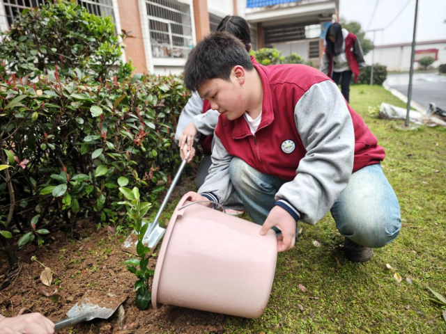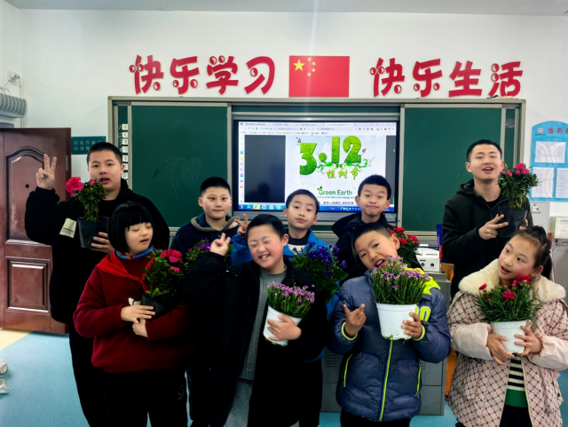 3月12日,沅江市特殊教育学校各班围绕“行动起来,为校园增添一点绿”主题开展班会活动。(通讯员 徐依鸣)