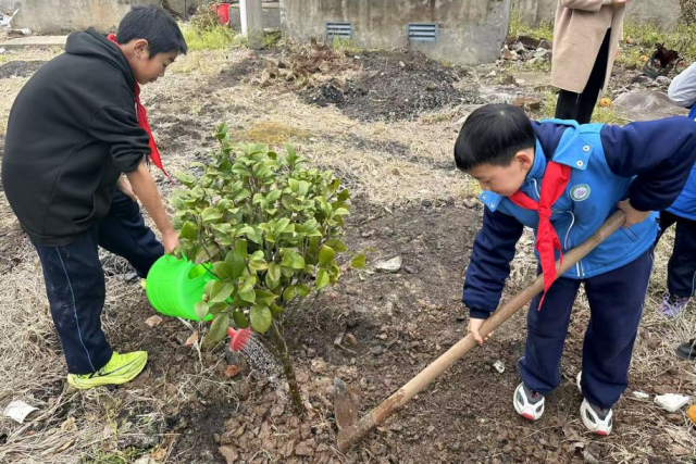 3月11日,沅江市桔园学校与共华镇中心小学联合开展以“绿动未来,爱满心田”为主题的植树活动。(通讯员 谭瑶笛 黄梦兰)
