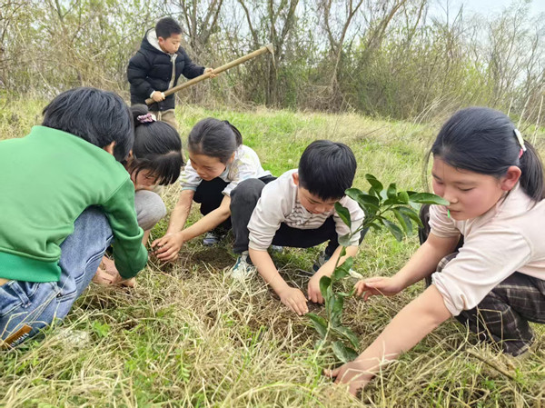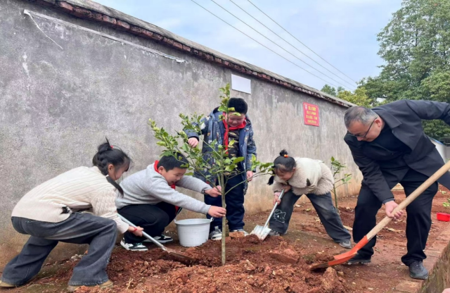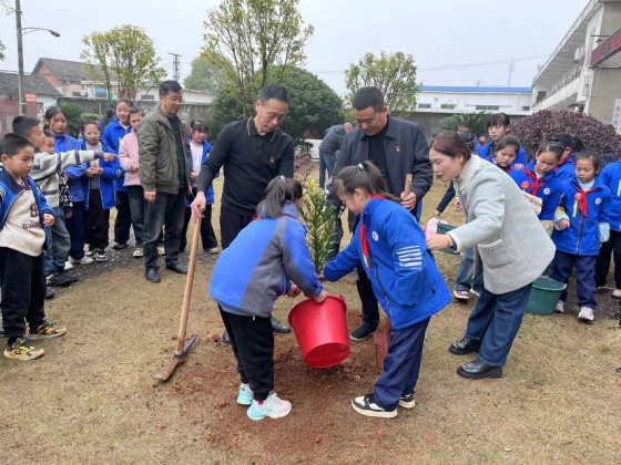 3月11日,沅江市共华镇中心小学与桔园学校联合开展“绿动未来,爱满心田”的植树活动。(通讯员 孔迎)