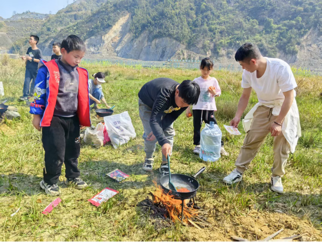 到达目的地后,在老师的指导下,同学们互相协作,搭建灶台、搬锅、搬水、洗锅、拾柴生火……一时间,整个区域热闹非凡,充满了青春活力。